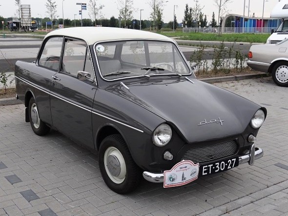 DAF, het merk van mijn oudtante Annie, die ermee in de Drentse Hoofdvaart belandde, waarbij haar bontjas haar redde: