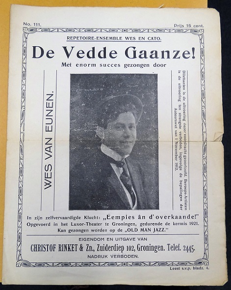 Vond vandaag een voordracht met lied in – volgens mij – stadsdialect. Het stukje dateert uit 1921 en gaat over een vent die met een biljartwedstrijd in de kroeg een vette gans won. De auteur was ene Wes van Eunen, die het schreef op de melodie van Arthur Collins’ Old Man Jazz, destijds (in het nog radioloze tijdperk) blijkbaar een hit: