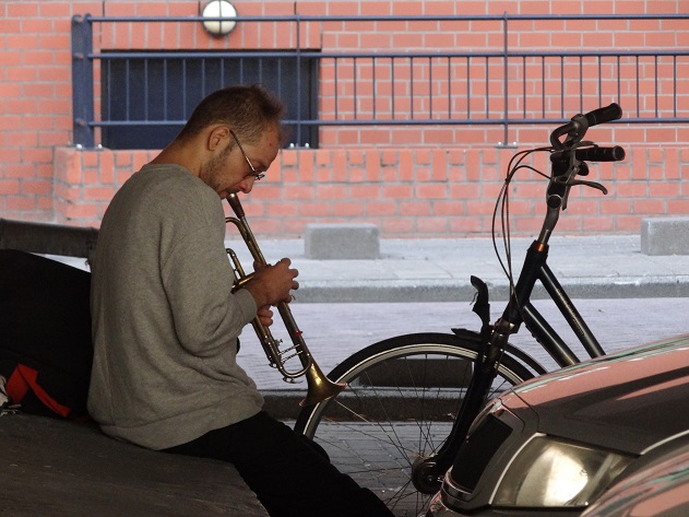 De laatste dagen zit hij er weer, aan het eind van de middag onder het Emmaviaduct, op een plek zonder passanten, dus om geld is het hem niet te doen. Hij repeteert alleen, met een bandje ter ondersteuning. Een prima akoestiek heb je daar.