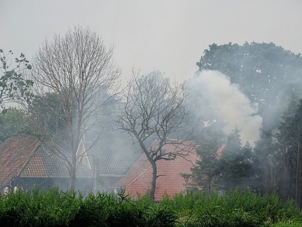 Bij Hoogezand leek iets in brand te staan. Moeilijk te zeggen wat het was – op de toeschouwers (links) af te gaan was het geen illegale vuilverbranding zoals je die in het weekend – als de milieu-inspectie niet werkt – wel vaker ziet op het Groninger platteland: