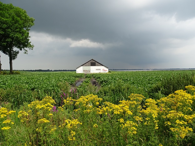 Dijklandschap vanaf dat pad – links de bekende dijkcoupure met schotbalkenhuisje van de Stadspolder: