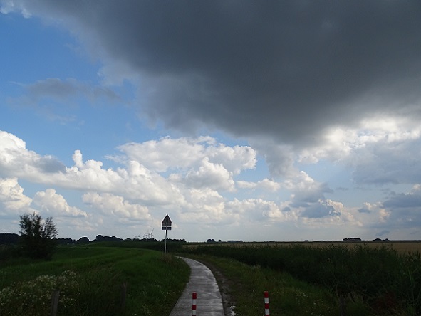 Na afloop was het lekker zoel en dreef net een bui af. Ik nam het nieuwe fietspad langs de Westerwoldse A naar Nieuweschans, met het voornemen om via de Beerta’s terug te fietsen naar Winschoten of Scheemda, maar onderweg opklimmend tegen A-dijk knapte mijn fietsketting, zodat ik alsnog al in Nieuweschans de trein terug moest nemen. Dat fietspad: