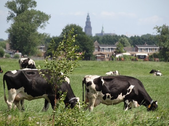Geplaatst op: 7 juli 2018 Hoort bij: Ommelanden, Stad nu 11 reactiesGrazend zwartbont vee bij het Aduarderdiep, met op de achtergrond de Martinitoren: