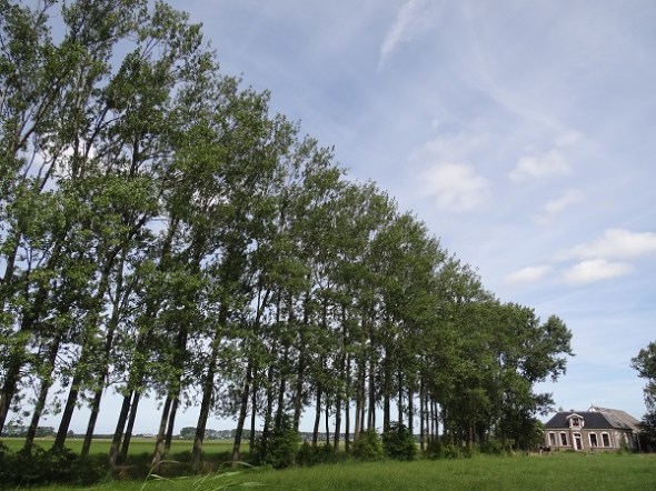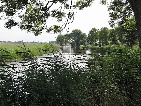 Dorpsgezicht van Finsterwolde gezien vanaf natuurgebied De Tjamme. Vrijwel overal staat de tarwe nog op de wortel, hier lijkt ze al aardig rijp, maar bij Oudeschans en Bellingwolde zag ik ze ook nog in diverse tinten groen.: