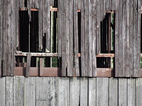 Op de laatste foto valt op dat de achtermuur van de hoofdschuur naar twee kanten verzakt. Het middendeel met de deuren staat nog wel in het lood.