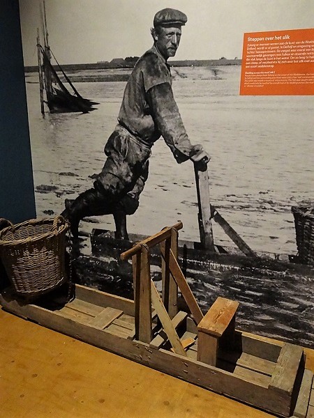 Op de foto: man met kraite of slikslee op het wad, met ervoor het echte werk. De mand diende om garnalen en/of platvis in te bergen. Op deze manier verdienden voorouders van me, de Bottinga’s (van bot) uit Finsterwolde en Termunten, de kost:.
