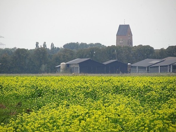 Stedum in de verte, over een veld met geel mosterdzaad, een groenbemester (met dank aan Maico):
