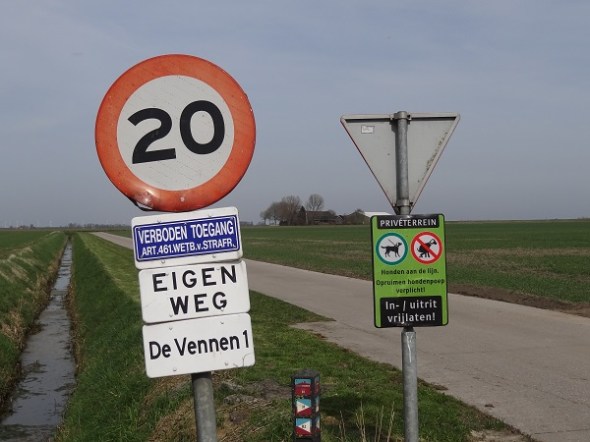 Eigen erf! Verbonden toegang! Privéterrein! De eigenaar lijkt niet erg gastvrij. Toch verzoekt hij de mensen ook om hun snelheid te matigen op zijn laan. Terwijl hij ze tevens waarschuwt voor een onveilige situatie als ze weggaan. Van hondeneigenaren verwacht hij bovendien dat ze hun honden aan de lijn houden en hun hondenpoep opruimen. En of de mensen vooral ook zijn in- en uitrit niet willen blokkeren: