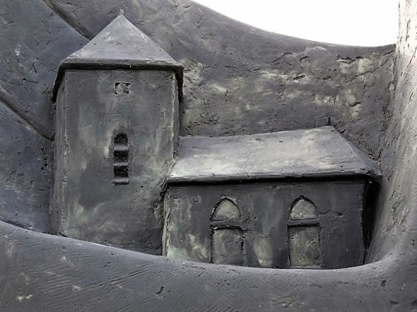 Microreliëf bij Stedum, met op de achtergrond elementen van het stadssilhouet van Groningen: