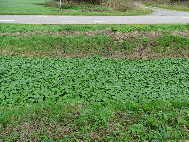 De grote waternavel heeft zo te zien vrij spel aan de oostkant van het Leekstermeer. Op de slenken raken de oevers met plakken bezet, en hier rijst de exoot een sloot langs de Hooiweg uit: