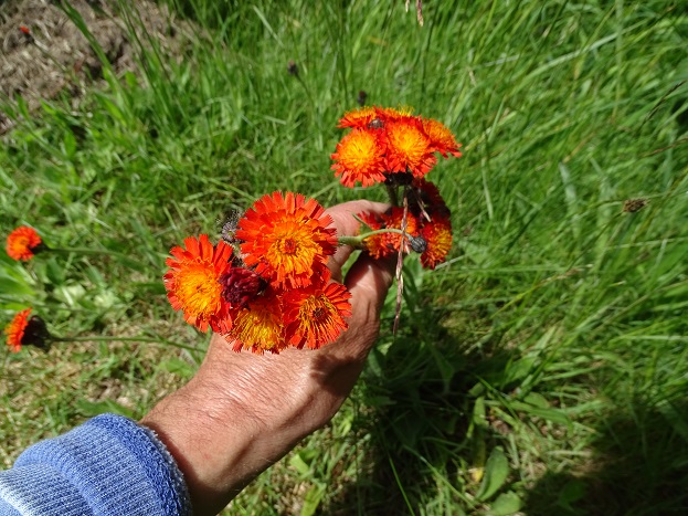 Haarveensedijk – het havikskruid stond hier dermate dicht opeen, dat er gemakkelijk een tuiltje van te vormen viel zonder ze te plukken: