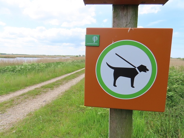 En dit is het bordje van Natuurmonumenten bij de Weringsedijk. De honden ogen beide al even mensvriendelijk, maar Natuurmonumenten heeft nog een didactisch extraatje toegevoegd in de vorm van een pijl naar de hondenriem. Opdat de hondenbezitters zich dit voor het aanlijnen van hun lievelingen onmisbare attribuut niet – zoals zo vaak – zullen vergeten.