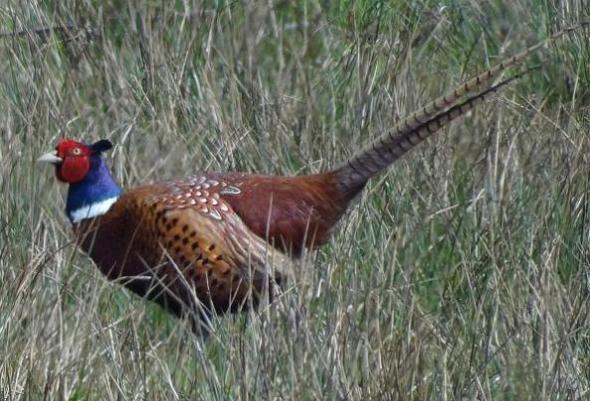 Tot slot een buizerd die op wegvloog toen ik met mijn fiets op het doodlopende, zuidelijke stuk van de Langmadijk om de hoek kwam. Hij landde op een paaltje 300 meter verder en blijkt een omgekeerd vredesteken op de borst te hebben: