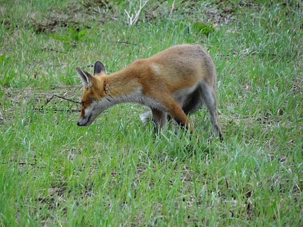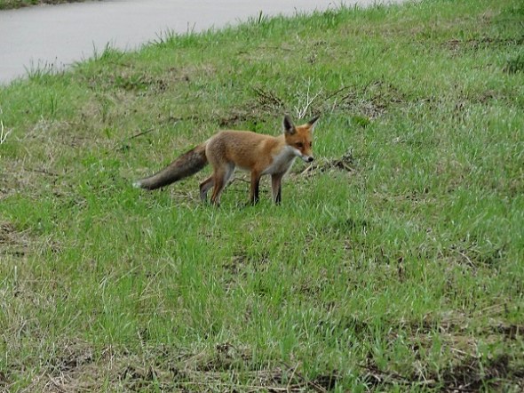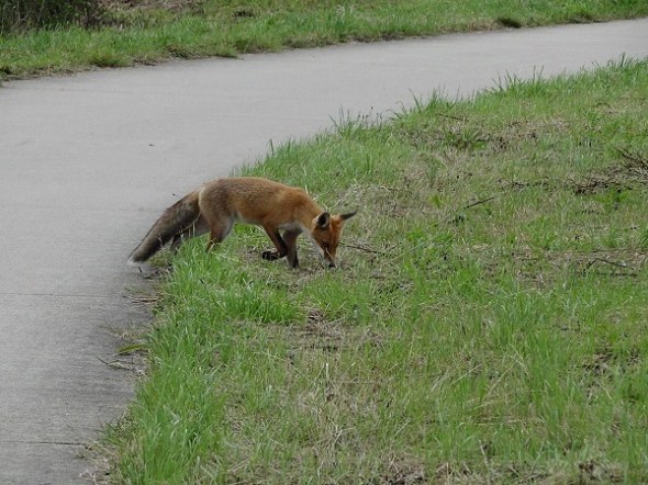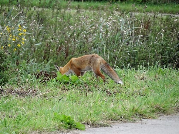 Geplaatst op: 17 augustus 2019 Hoort bij: Dieren, Onlanden Een reactie plaatsenIk kwam terug van een fietstochtje door het Westerlkwartier, het weer betrok, zonder dat dit tot regen leidde. Voorbij de op een na laatste Omlander brug, in de verte, zag ik een groepje mensen gebiologeerd naar iets kijken. Het was een vos die in de berm langs het fietspad scharrelde. Hij bleek totaal niet schuw en trok zich nergens wat van aan. Hoewel hij er een stuk gezonder uitziet, zou het wel eens de vos kunnen zijn die dit voorjaar naar de enkel van een fietster hapte. Het ging in elk geval om dezelfde omgeving. Kreeg het idee dat iemand hem zit te voeren::
