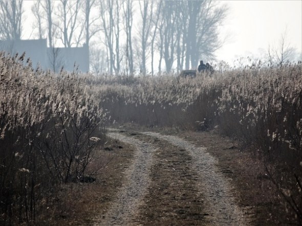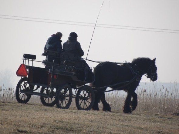 Met de koetsewagen via een dijkje de Onlanden in: