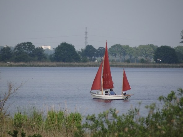 Heel erg rustig op het meer – het enige scheepje dat er voer had zuringrode zeilen: