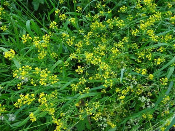 Fluitekruid, raapzaad en boterbloemen op de oever van het Peizerdiep bij de Baileybrug: