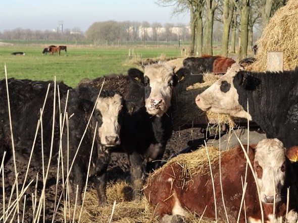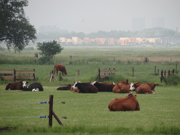 Herkauwende blaarkoppen met op de achtergrond, in een sprank zon, het nieuwe Eelderwolde: