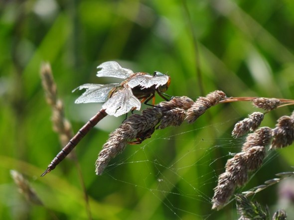 Gehavende bloedrode heidelibel aan de Onlanderdijk – ik vermoed dat kokmeeuwen erop jagen: