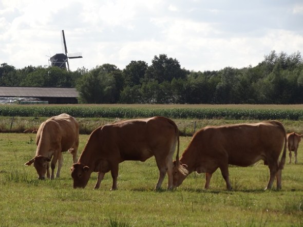 Rood vee bij de Bommelier met de molen van Roderwolde op de achtergrond: