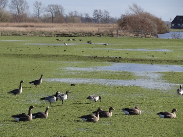 Nog veel ganzen op het drassige land bij De Gouwe: