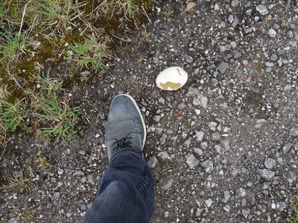 Geroofd ganzenei op het steenslagpad: