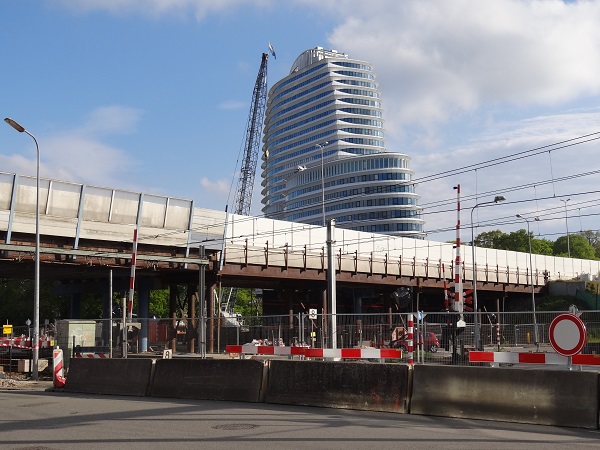 Na het parkeren van mijn kapotte fiets in de fietsenkelder van mijn werk op zoek naar de nieuwe bushalte bij de Paterswoldsewegtunnel. De KPN-borg, het Emmaviaduct en de Van Hallbrug vanaf het perron daar: