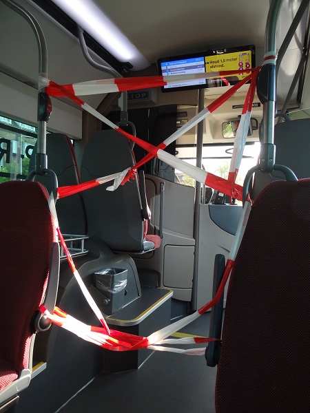 De eerste keer dat ik sinds half februari met de bus ging. Achter instappen s.v.p.. Gelieve niet te spreken met de chauffeur is nu geworden: Gelieve een eind weg te blijven van de chauffeur. Hij groette trouwens wel vriendelijk (wat ook niet altijd het geval is):