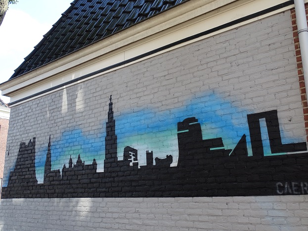 Nieuwe muurschildering met fictief, samengeraapt stadssilhouet op de hoek van de Mauritsdwarsstraat en de Mauritsstraat in de Oosterpoort. Van links naar rechts de Apenrots van de Gasunie, de Dronkemanstoren met de Jozefkerk, het Academiegebouw, de Martinitoren, het Groninger Forum, het Groninger Museum, iets wat ik niet thuisbrengen kan en de Tasmantoren: