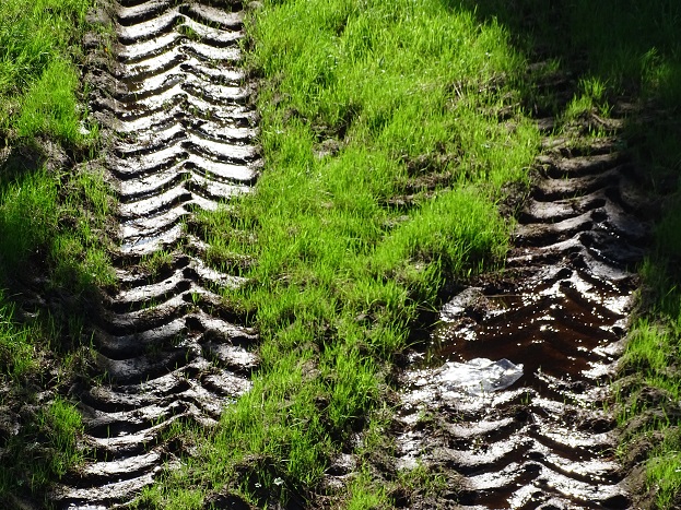 Trekkersporen in het natte gras onderaan het viaduct over de A7 voorbij Engelbert: