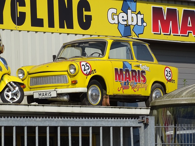 Een eindje verder zit een concurrent met een kanariegele Trabant op een platform. Het brikje is voorzien van de ideale snelheid: