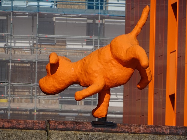 Op de kolenmuur balanceert een speels oranje hondje als ornament: