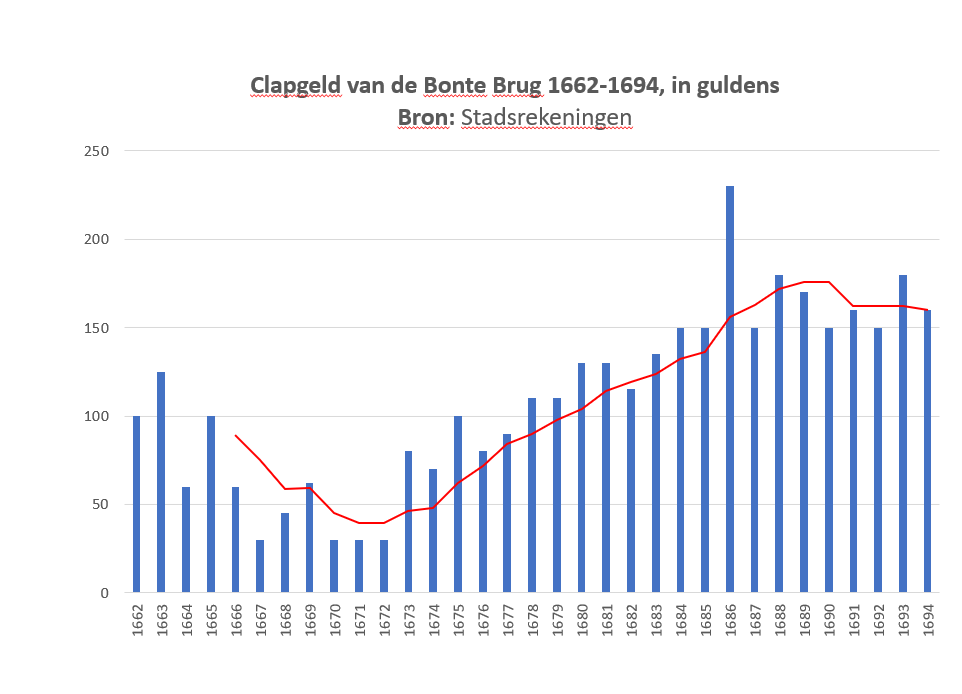 Wel noteerde ik uit de stadsrekeningen ooit de bedragen, waarvoor de inning van het klapgeld ieder jaar verpacht werd, wat gebeurde op afmijningen (veilingen bij afslag in plaats van opbod). De gerealiseerde pachtsommen weerspiegelen derhalve de verwachtingen die de kandidaat-pachters hadden van de sommen die ze in het komend jaar bij elkaar zouden weten te innen. Of het nu om veenkoloniale schepen ging dan wel passanten te voet of te paard – die verwachtingen hingen samen met schatting die de kandidaat-pachters hadden van de verkeersintensiviteit bij de klapbrug en hoe die zich in het komende jaar zou gaan ontwikkelen. Bij een stijging van de pachtsommen werd een groei van die verkeersintensiviteit verwacht, bij een daling een vermindering. Hier dan de grafiek van die pachtsommen (blauwe staafjes nominale opbrengsten, rood voortschrijdende vijfjaarlijkse gemiddelden).