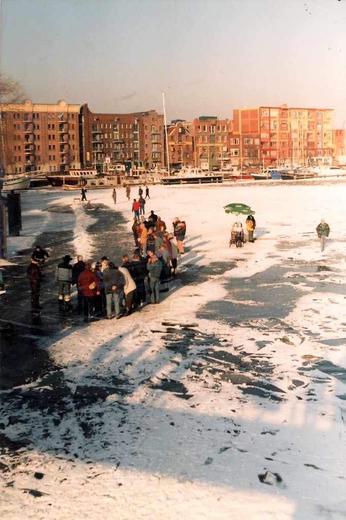 Men hoopte er een jaarlijkse traditie van te maken. Wat het niet heeft mogen worden. Sowieso was het destijds al een wonder dat die haven dichtvroor. Zolang de Hunzecantrale (die van de vijf pijpen) in werking was, voerde ze het opgewarmde koelwater af door het Oude Winschoterdiep en de Oosterhaven, die dus nooit dichtvroren, alleen een paar keer in de jaren dat de centrale gestopt was en gesloopt werd. Inmiddels voltrekken we met zijn allen een klimaatramp, en zal het er wel nooit meer van komen.