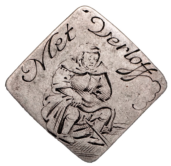 De Stadjers van 1672 gaven op velerlei wijze lucht aan hun afkeer van de agressor Bommen Berend. Zo krasten ze op de lege achterkant van eenzijdig gestempelde, vierkante noodmunten spottende voorstellingen van, en schimpverzen op de Munsterse bisschop. Zoals deze hierboven van een hurkende vrouw met opgetrokken rokken die zich op de (denkbeeldige) belegeringstroepen ontlast, er bijna letterlijk schijt aan heeft.