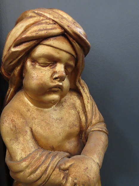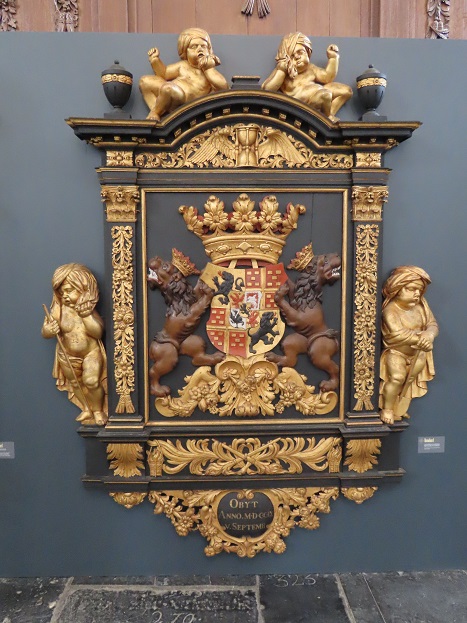 De staande engeltjes links en rechts van het wapenschild vond ik mooi, vooral ’t rechter, dat bij alle treurnis het waken zowat vergeet en een beetje lijkt weg te dommelen: