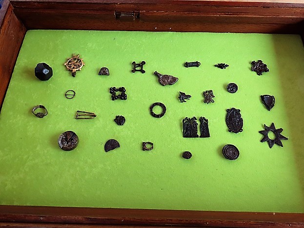 Op de tafel in de stand lag ook een vitrine met metalen voorwerpjes die al eerder onder de Grote Markt vandaan waren gekomen – rechtsonder herken ik in de ster met gat een snorrebotje, kinderspeelgoed waarmee je gevlochten draad als het ware kunt laten zingen::