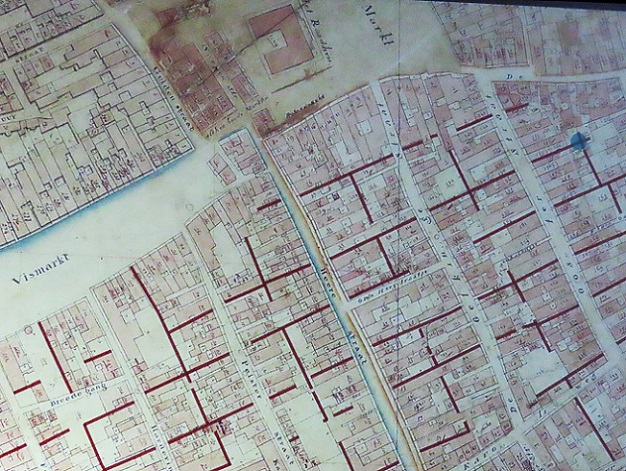 De kavels ten zuiden van beide markten omstreeks 1040, ingetekend op de oudste kadasterkaart van ca. 1830. Veel straten hier waren verdiept aangelegd – van het maaiveld werd een halve meter afgegraven, de vrijkomende grond gebruikte men voor huispodia: