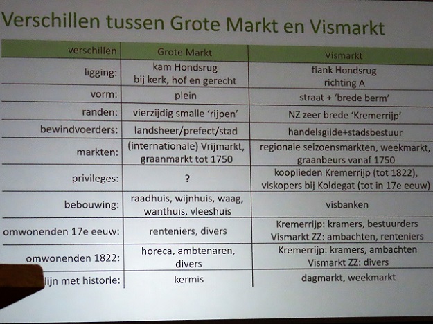 Terwijl de Grote Markt vanaf eerste opzet een plein was, ging het bij de Vismarkt eigenlijk om een weg met zeer brede bermen. Wat er verhandeld werd, verschilde ook. De omwonenden waren bij de Vismarkt vooral koop- en ambachtslui, terwijl het bij de Grote Markt primair ging om stadsheren, ambtenaren en renteniers. Horeca zat juist vooral aan de Grote Markt, wat waarschijnlijk samenhing met de bestuurlijke, juridische en kerkelijke functies op en aan dat plein. Kortom: de Grote Markt was meer officieel, waar er aan de Vismarkt meer handel zat: