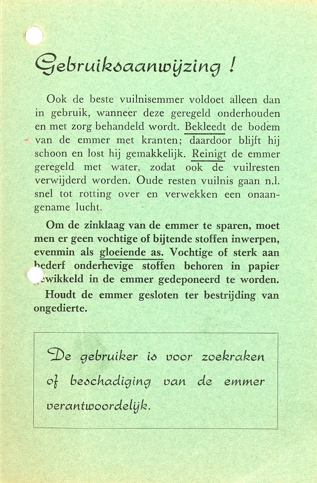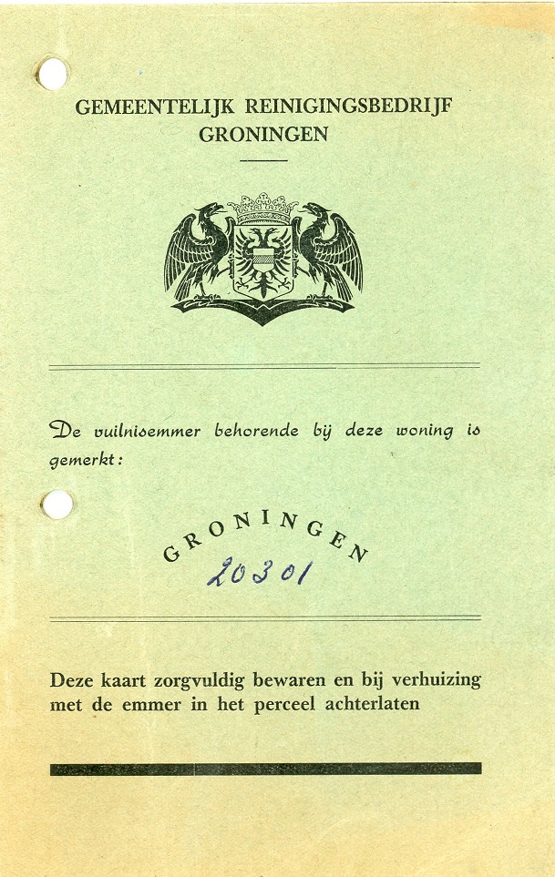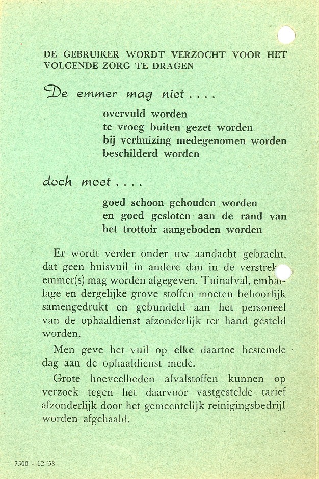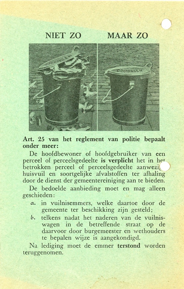 Geplaatst op: 25 augustus 2023 Hoort bij: Stad toen 4 reactiesQua typografie en gemeentewapen zo te zien stammend uit de jaren 50/60. Ooit aangetroffen in een antiquarisch aangeschaft boek. Ik denk niet dat veel van deze registratiekaarten bewaard gebleven zijn, sinds de vuilniszak de vuilnisemmer verving (eind jaren 70) en je de zakken naar ondergrondse containers moest brengen in plaats van ze bij de stoeprand neer te mogen zetten (jaren 90). De gemeente deed er een reglementje bij::