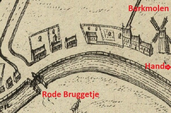 “omme ordre te stellen, dat tot minste schade en beste mesnage van de Stat, bij het roode bruckjen achter de berckmeulen een houten handt wierde gestelt, alwaar een jegelijcke schuitevaerder ofte ander schipper s[i]nen seijl sal hebben te strijcken”