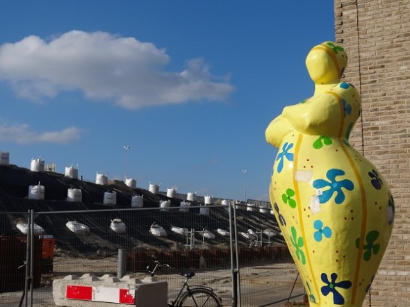 Vrouw Wichers (Mette Bus, 1984) op de uitkijk bij het met zandzakken verstevigde talud van de zuidelijke ringweg:
