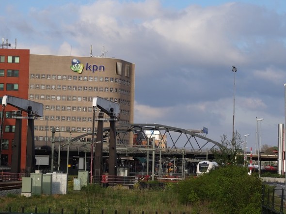 Na het parkeren van mijn kapotte fiets in de fietsenkelder van mijn werk op zoek naar de nieuwe bushalte bij de Paterswoldsewegtunnel. De KPN-borg, het Emmaviaduct en de Van Hallbrug vanaf het perron daar: