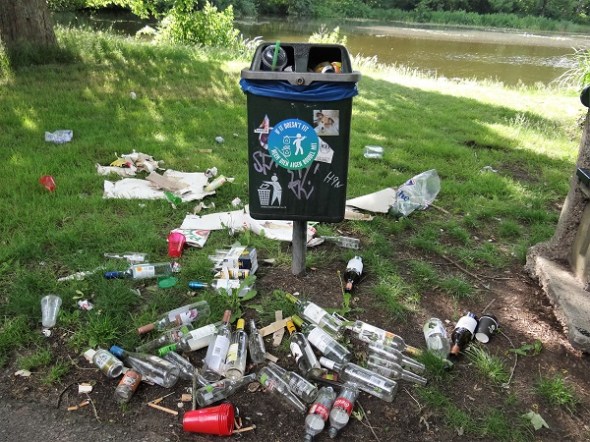 Dat durven leven komt trouwens vaak neer op ongebreideld zuipen. Niet voor niets zong Ramses Shaffy dat lied zo graag. Een eindje voorbij de plek waar de demonstratie had plaatsgevonden, trof ik dit tafereel aan. Op de prullenbak staat nota bene een sticker: If it doesn’t fit, neem dien aigen boudel mit. Een boodschap die duidelijk niet werd begrepen: