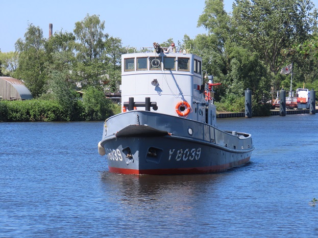 Bij het Nieuwe Winschoterdiep voor de brug heb ik moeten wachten op de sleepboot Y8039 Dommel van de vaderlandse marine, welk dienstvaartuig in 1957 werd gebouwd bij scheepswerf Bodewes te Millingen aan de Rijn::
