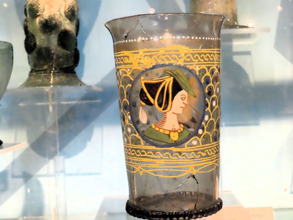 Topstuk, deze gerestaureerde beker van dun Boheems glas, met een vrouwenportretje naar een prent van Heirich Vogtherr uit 1538:
