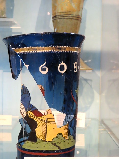 Drinkbeker van kobaltblauw boheems glas uit 1608, met fragment van een voorstelling waarop een jongen bij wijze van tuchtiging met een roe voor zijn blote bibs krijgt: