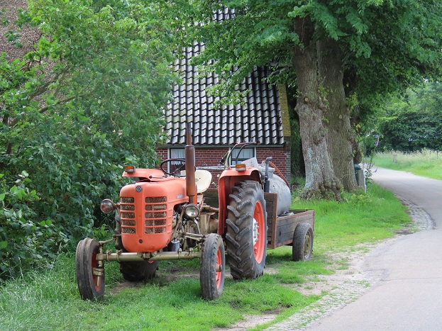 Vintage trekkertje met melktank bij boerderij met rijtje linden aan het Achterstewold: