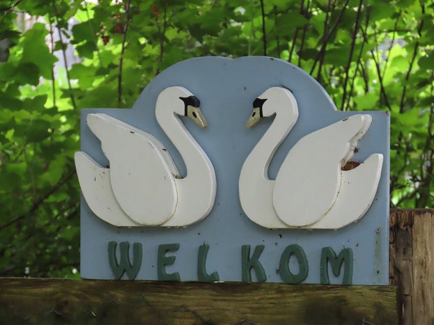 Wekomstbord met gefiguurzaagde zwanen achter het sportpark van Peize: