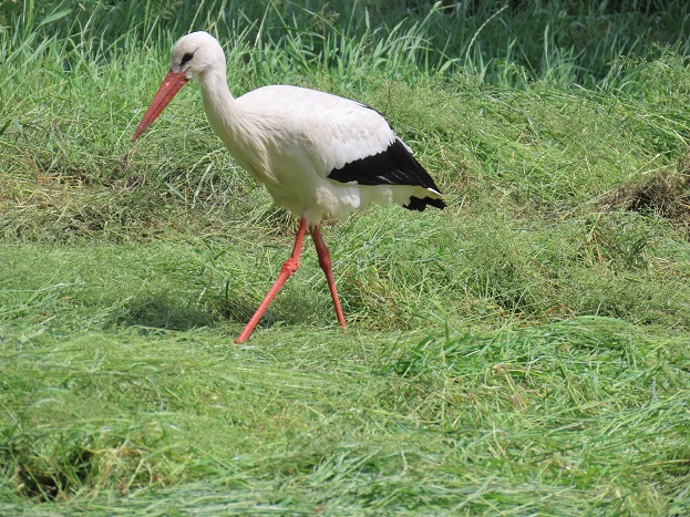 Fouragerende ooievaar in Foxwolde, waarschijnlijk een exemplaar dat een nest heeft op een afgeknotte bomenrij bij een boerderij aldaar: